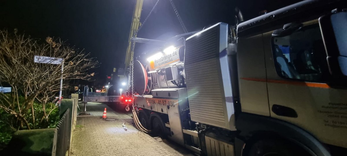 Nachdem alle Möglichkeiten der Bergung mit dem Straßenbaulastträger und dem Halter des Fahrzeugs besprochen waren, wurde ein Bergungsunternehmen informiert, das das Fahrzeug wieder auf die Fahrbahn stellen sollte. Hier unterstützen wir weiterhin durch Ausleuchten der Straße. Nachdem der Lastkraftwagen wieder auf der unbeschädigten Fahrbahn stand und zur Seite gefahren wurde, unterstützten wir beim Aufbauen der Absicherungszäune.