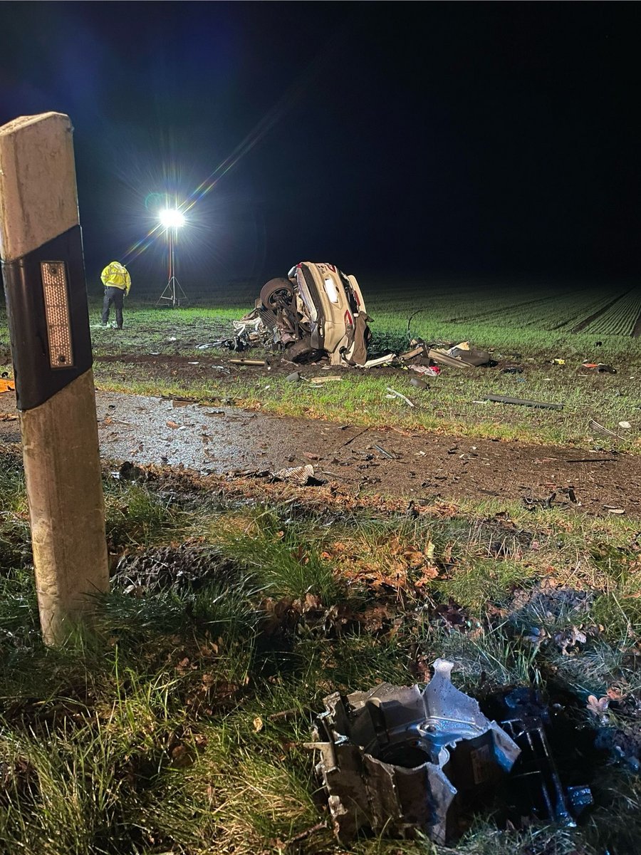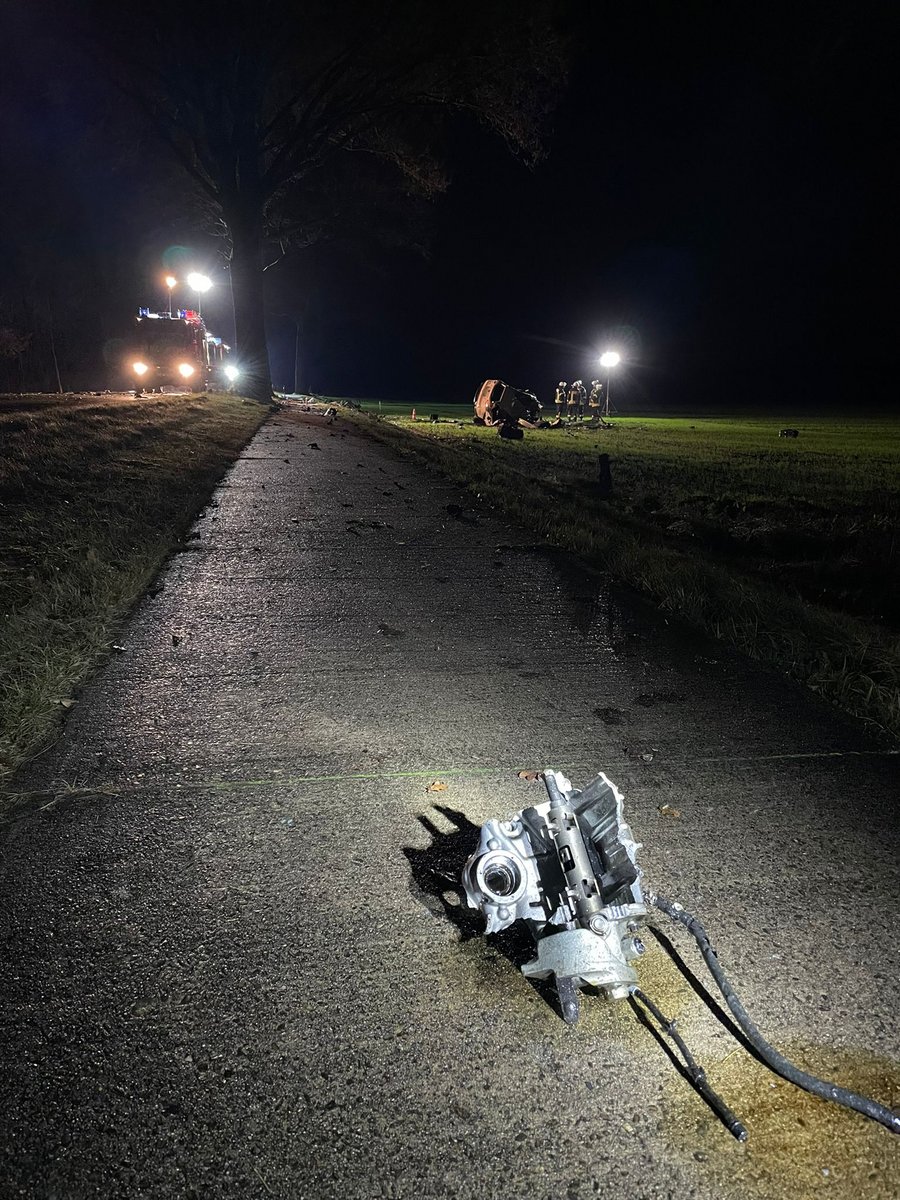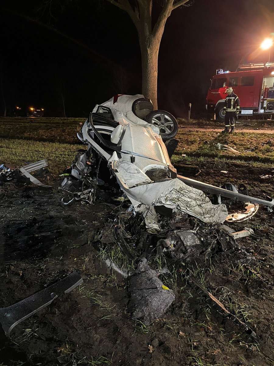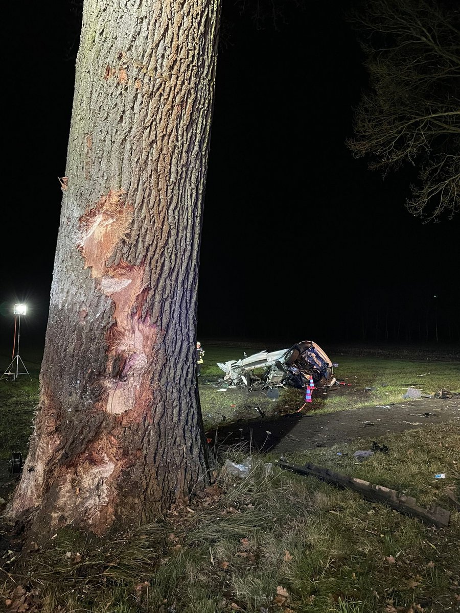 Ein Fahrzeug ist alleinbeteiligt mit hoher Geschwindigkeit von der Fahrbahn abgekommen und mit einem Baum kollidiert. Hierbei wurde das Fahrzeug erheblich beschädigt.